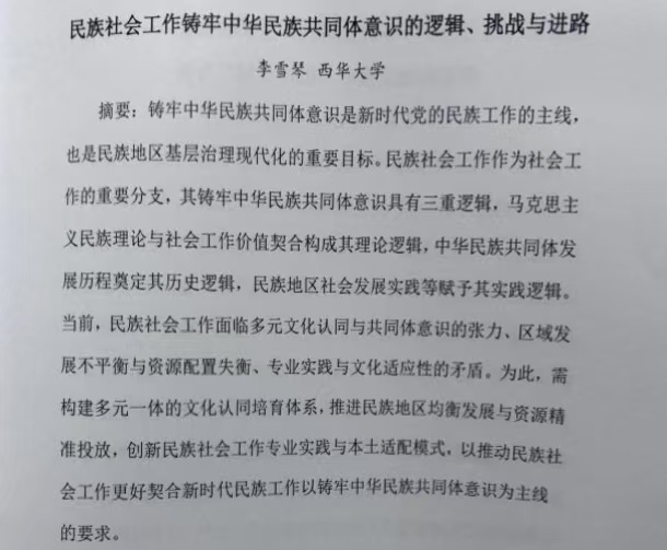 18日下午,与会学者围绕“民族社会工作的实务实践”“中国式现代化与新时代西北地区社会工作高质量发展”“铸牢中华民族共同体意识主线与民族社会工作的理论体系”“民族社会工作实践与铸牢中华民族共同体意识”等议题展开研讨。我院研究生李雪琴撰写的论文《民族社会工作铸牢中华民族共同体意识的逻辑、挑战与进路》在“民族社会工作实践与铸牢中华民族共同体意识”论坛进行发言并收录摘要集。