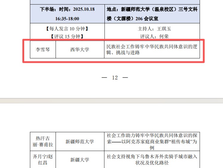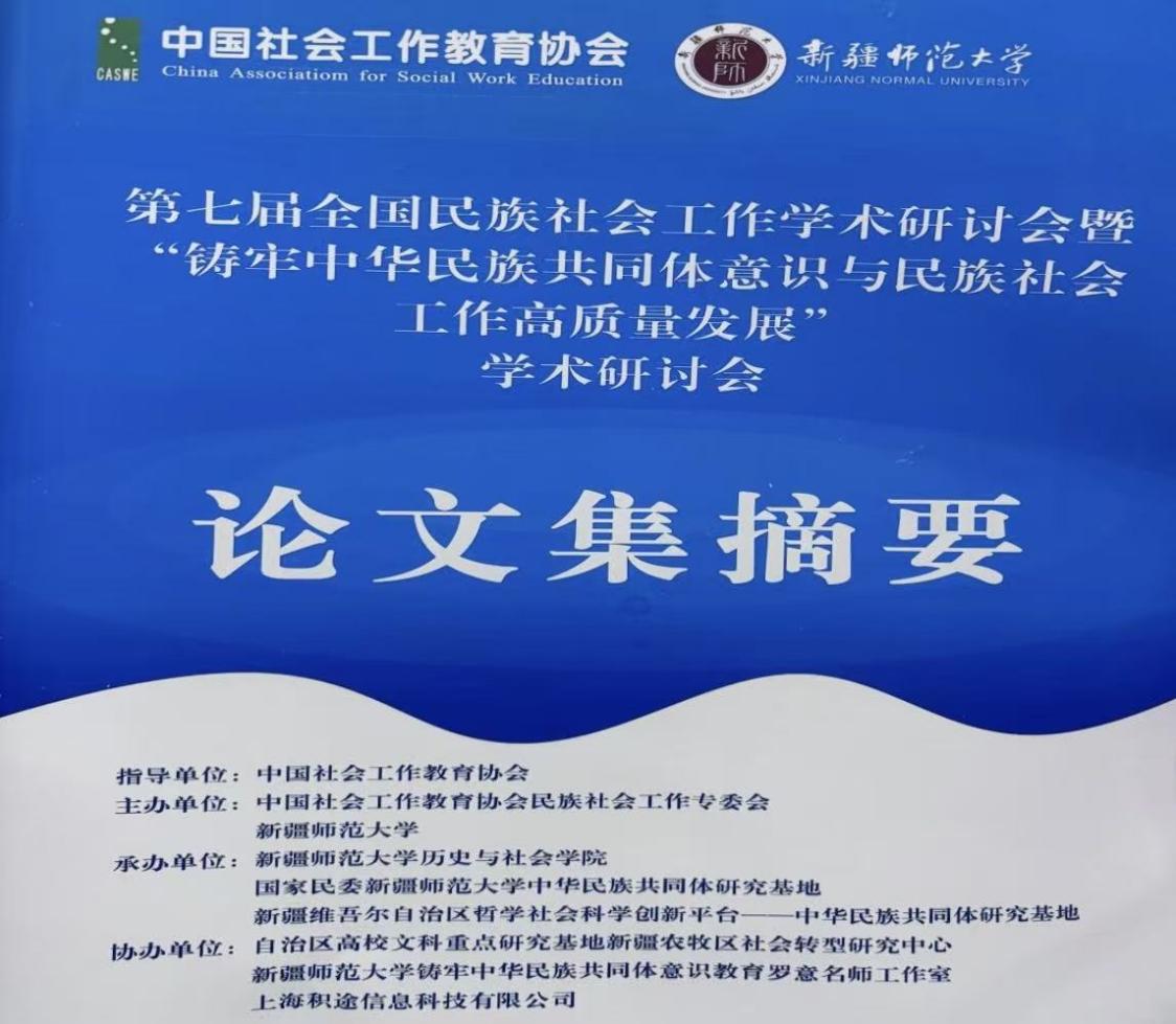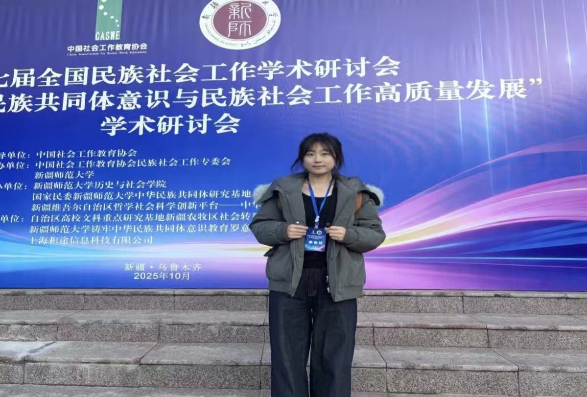 10月18日,由中国社会工作教育协会民族社会工作专委会主办、新疆师范大学历史与社会学院、国家民委新疆师范大学中华民族共同体研究基地、新疆维吾尔族自治区哲学社会科学创新平台-中华民族共同体研究基地承办,新疆维吾尔自治区普通高校重点文科基地:新疆农牧区社会转型研究中心,上海积途信息科技有限公司协办的“第七届全国民族社会工作学术研讨会暨铸牢中华民族共同体意识与民族社会工作高质量发展”会议在新疆乌鲁木齐隆重召开。我院2024级研究生李雪琴受邀参会。