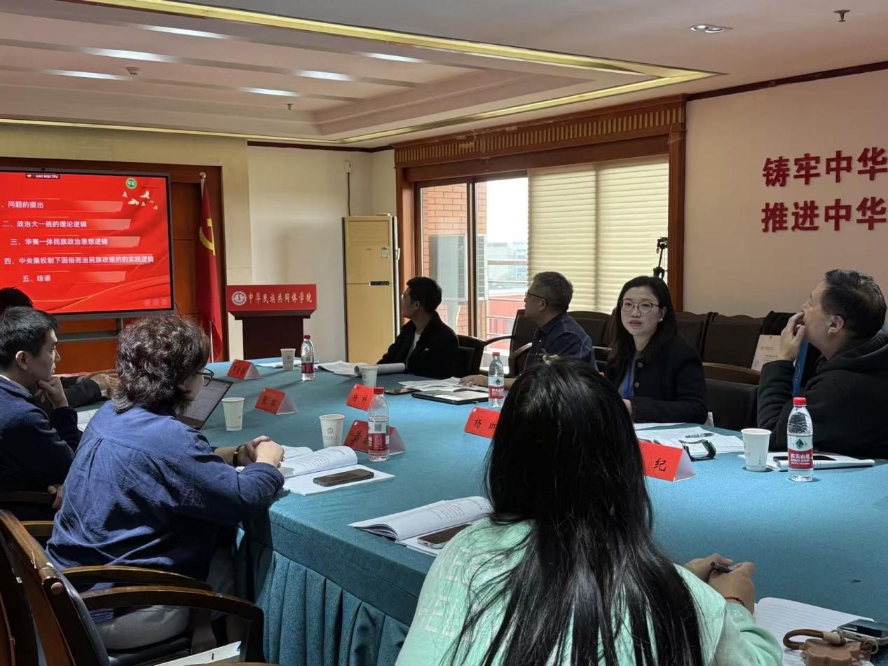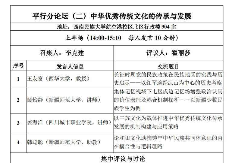 下午为平行分论坛研讨会。会议共设立七个分论坛,分别围绕“马克思主义共同体理论中国化时代化”“中华优秀传统文化的传承与发展”“民族交往交流交融的历史脉络与文化互动”“民族团结进步立法与基层社会治理”等议题展开交流研讨。我院王友富教授与2024级研究生盛文琴、2025级研究生郑姣姣在“中华优秀传统文化的传承与发展”论坛就共同撰写的《长征时期党的民族政策在民族地区的实践与历史启示——以红军途经凉山为中心的个案考察》一文进行交流,以长征时期党和红军在凉山地区的民族政策的实践及其历史启示展开分享。我院教师杨琳博士在“马克思主义共同体理论中国化时代化”论坛就撰写的《自在发展时期中华民族共同体意识形成、发展的政治逻辑》一文进行分享,围绕在中华民族自在发展时期,中华民族共同体意识形成、发展的政治逻辑展开交流。
