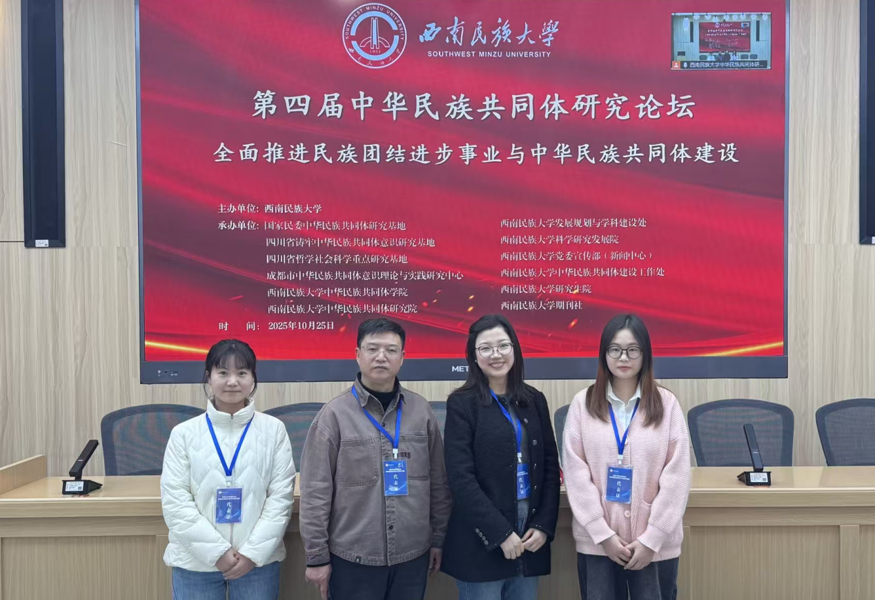 10月25日,由西南民族大学主办、国家民委中华民族共同体研究基地、四川省铸牢中华民族共同体意识研究基地等单位承办的“西南民族大学第四届中华民族共同体研究论坛”在西南民族大学航空港校区举行。来自中南财经政法大学、武汉大学、四川大学、中央民族大学、中共凉山彝族自治州委党校、西北民族大学、西华大学等省内外高校、党校系统的专家学者、硕博士研究生参加研讨会。西华大学马克思主义学院王友富教授与杨琳博士、2024级研究生盛文琴与2025级研究生郑姣姣受邀参会。