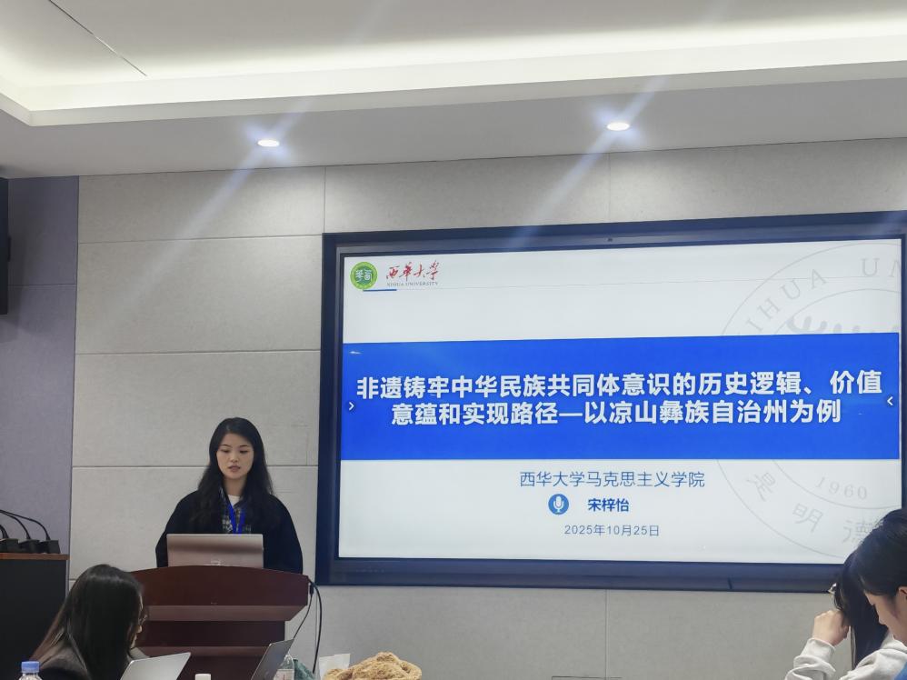 我院2023级研究生宋梓怡在分论坛一就《非遗铸牢中华民族共同体意识的历史逻辑、价值意蕴和路径选择—以凉山彝族自治州为例》进行了汇报发言。论文从非遗与铸牢中华民族共同体意识“共创”“共感”和“共识”的历史逻辑出发,强调非遗在增强中华文化认同、促进各民族广泛交往交流交融、提升国家文化安全与软实力方面的独特价值。未来应从强化非遗保护与传承、推动非遗融入民族团结教育、促进非遗的创造性转化和创新性发展等角度出发,为民族地区高质量发展和中华民族伟大复兴贡献文化力量。