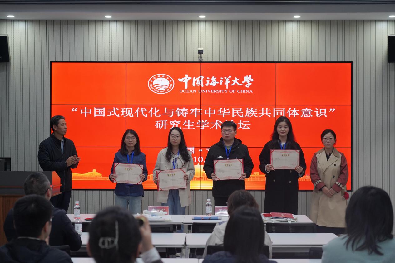 闭幕式上,由中国海洋大学马克思主义学院党委副书记王付欣教授、中国海洋大学党委统战部副部长王俊玲进行致辞并颁奖,我院2023级研究生宋梓怡的论文《非遗铸牢中华民族共同体意识的历史逻辑、价值意蕴和路径选择—以凉山彝族自治州为例》荣获二等奖。