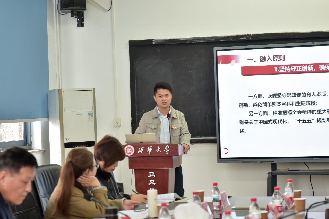 学院党委书记万远英主持会议,副院长尹德志简要介绍了本次集体备课会的筹备情况。会议指出,学习好、贯彻好党的二十届四中全会精神是当前马克思主义学院一项重大的政治任务,思政课是落实立德树人根本任务的关键课程,思政课教师不仅要全面准确掌握全会精神,还要及时将全会精神融入思政课教学中。在融入思政课各门课程的教学过程中,应注意把握正确的原则和方法,一要坚持全面和重点相统一,引导学生全面学习和掌握全会精神,二要坚持文本解读和精神学习相统一,以完整的文本解读实现全会精神的掌握,三要坚持思政小课堂和社会大课堂相统一,以深度的理论学习引导学生在实践中感悟真理的强大伟力。