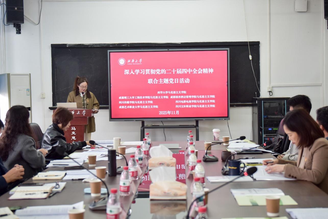 在全国上下深入学习和贯彻党的二十届四中全会精神之际,11月6日下午,由西华大学马克思主义学院举办的党的二十届四中全会精神融入思政课“手拉手”集体备课会暨联合主题党日活动在第一教学楼5015会议室举行。四川电影电视学院马克思主义学院、四川传媒学院马克思主义学院、成都银杏酒店管理学院马克思主义学院、成都理工大学工程技术学院马克思主义学院、成都艺术职业大学马克思主义学院、四川文轩职业学院马克思主义学院等6所结对共建学院负责人和思政课教师代表应邀参会。西华大学马克思主义学院主要负责人和各系部(教研室)主任参加会议。