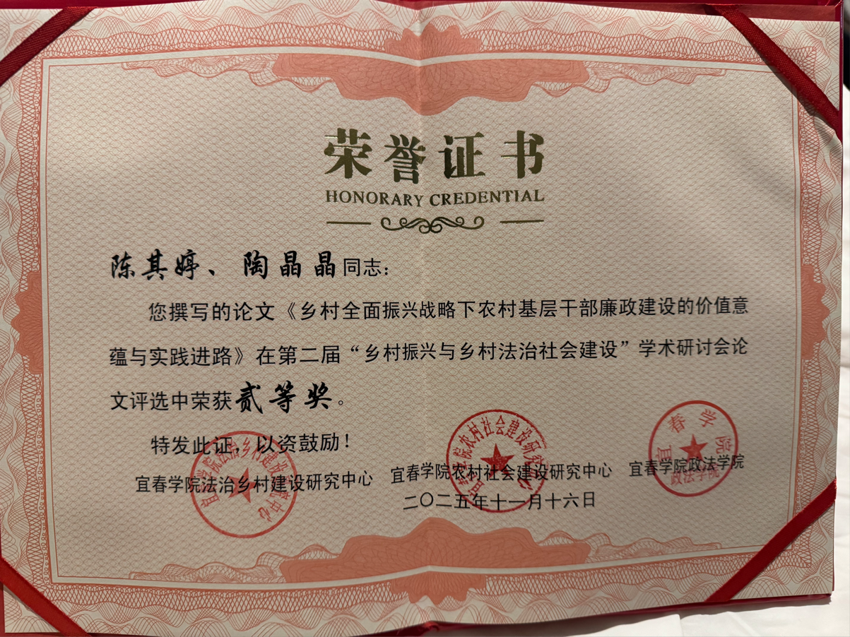 我院研究生陶晶晶撰写的论文《乡村全面振兴战略背景下基层干部廉政建设的价值意蕴和实践进路》,系统阐释了基层干部廉政建设的价值意蕴,深入分析其现存问题,并探索了基础干部廉洁履职的实践进路。该论文凭借扎实的研究功底与鲜明的学术价值,荣获本次研讨会征文二等奖。