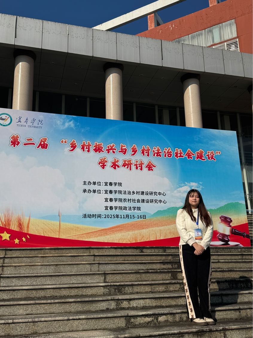 11月16日,第二届“乡村振兴与乡村法治社会建设”学术研讨会在江西宜春顺利召开。此次会议由江西省教育厅与司法厅研究基地宜春学院法治乡村建设研究中心、江西省高校人文社科重点研究基地宜春学院农村社会建设研究中心、宜春学院政法学院联合主办,汇聚了来自南开大学、同济大学、天津财经大学等全国多所高校的50余名专家学者、青年学人及硕博士研究生。我院2024级马克思主义理论专业研究生陶晶晶受邀参会。