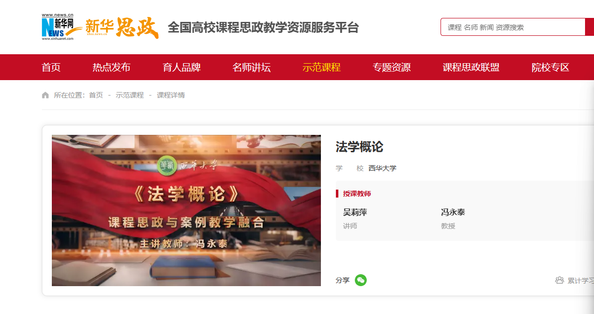 近日,由我院冯永泰和吴莉萍两位老师共同打造的课程思政教学案例课《法学概论》在新华网“新华思政——全国高校课程思政教学资源服务”平台上线,面向全社会开放共享我院的优质课程资源。