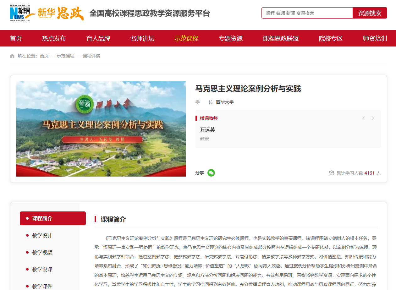此次课程思政教学案例课《法学概论》入选上线,这是我院加强课程思政建设工作的又一成果。2024年,由我院万远英教授主讲的课程思政教学案例课《马克思主义理论案例分析与实践》上线新华网“新华思政——全国高校课程思政教学资源服务”平台。该课程是马克思主义理论研究生必修课程,也是实践教学的重要课程。该课程围绕立德树人的根本任务,秉承“悟原理—重实践—强协同”的教学理念,将马克思主义理论的核心内容及其组成部分按照内在逻辑组成一个专题体系,以案例分析为统领,理论与实践教学相结合,通过案例教学法、链条式教学法、研究式教学法、专题讨论法、情景教学法等多种教学方式,将价值塑造、知识传授和能力培养紧密融合,形成了“知识传授+思维激发+能力培养+价值塑造”的“大思政”协同育人效应。通过案例分析帮助学生提炼和分析出案例中所含的基本原理,培养学生运用马克思主义的立场、观点和方法分析问题和解决问题的能力。有效利用易班、青梨派等教学资源,实现面向需求的个性化学习,激发学生的学习积极性和自主性,学生的学习空间得到有效延伸。充分发挥课程育人功能,推动课程思政与思政课程同向同行,努力培养堪当民族复兴大任的时代新人。本课程教学改革成效在全国思想政治教育年会、四川省高校研究生思政课研究会做交流发言,得到同行好评。中国社会科学网、学习强国等媒体以“西华大学上演别样学习成果展示会”为题对研究生“青春告白祖国”等活动进行报道。
