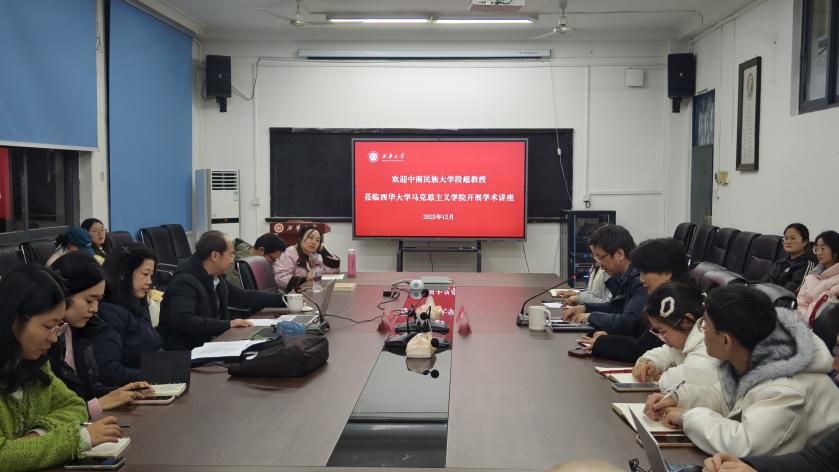 2025年12月17日晚,西华大学马克思主义学院在1A-5015教室举办主题为《铸牢中华民族共同体意识的核心要义和研究前沿》的学术讲座。本次讲座由中南民族大学段超教授主讲,西华大学马克思主义学院冯永泰院长主持。本次讲座聚焦民族工作理论创新与学术研究前沿,旨在为师生搭建学术交流平台,并为拟申报国家课题的教师提供指导。