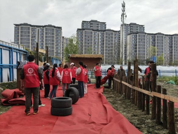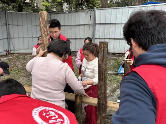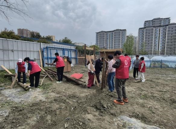 下午2点,活动在仁合社区研学实验基地准时开始。现场,志愿者们与社区工作人员分工协作,有条不紊地推进各项工序。一部分志愿者负责搬运场地内散落的废弃枯木和旧木料;另一部分志愿者则手持锄头,在规划区域挖出深度和间距适宜的坑位;还有的志愿者负责将搬运来的木头精准置入坑中,并使用工具进行固定和连接。大家配合默契,现场秩序井然。
