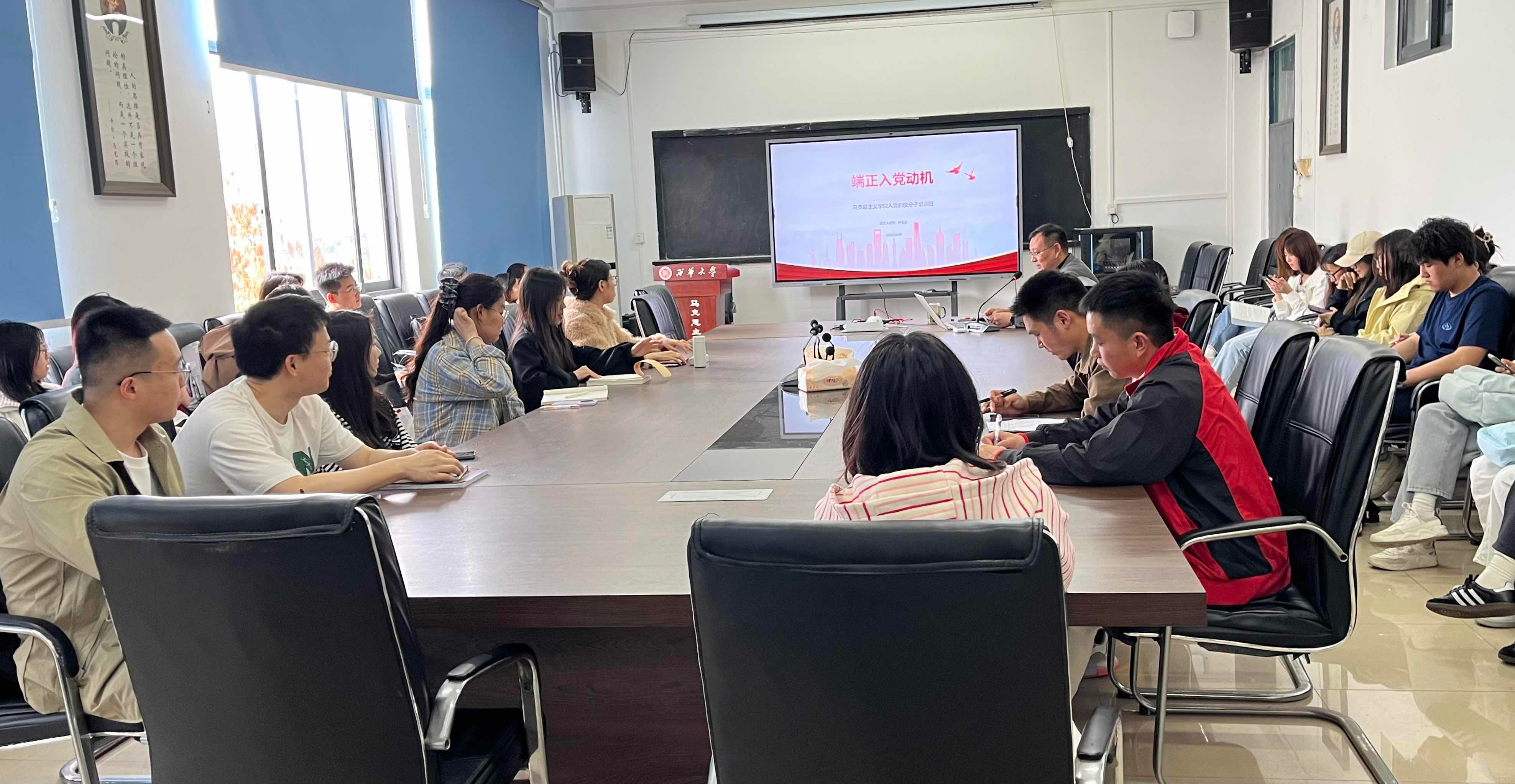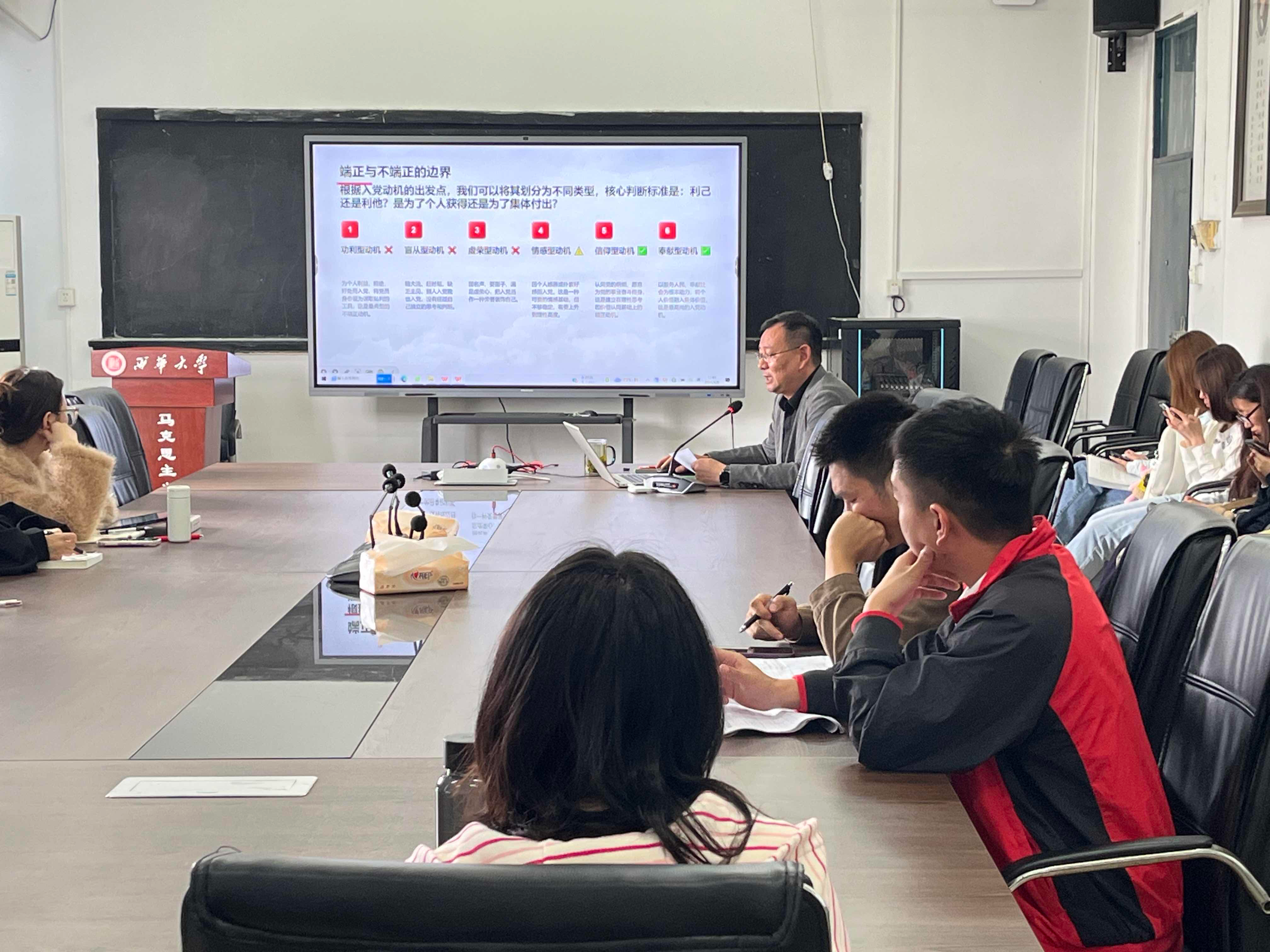 为加强入党积极分子党性教育,引导青年学子树立坚定理想信念,4月8日中午,西华大学马克思主义学院党委副书记、纪委书记钟灵波在学院5015会议室,以“端正入党动机”为主题,为学院2026年春季学期入党积极分子培训班全体学员讲授专题党课。