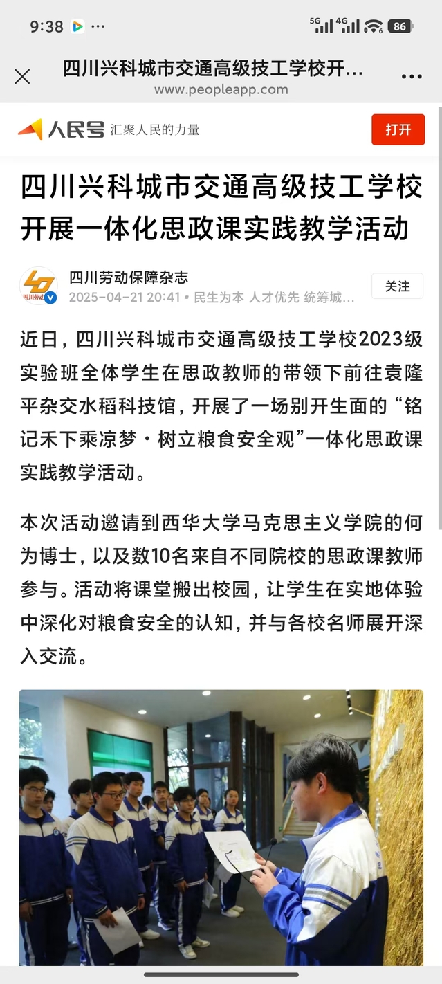 近日,四川兴科城市交通高级技工学校2023级实验班全体学生在思政教师的带领下前往袁隆平杂交水稻科技馆,开展了一场别开生面的 “铭记禾下乘凉梦・树立粮食安全观”一体化思政课实践教学活动。