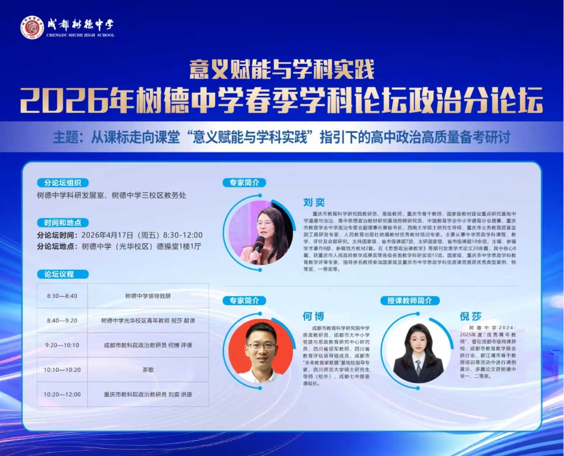 2026年4月17日,为深化新课标理念下的高中政治教学改革,提升思政教育与高考备考的融合质量,成都树德中学光华校区举行了以“从课标走向课堂——‘意义赋能与学科实践’指引下的高中政治高质量备考研讨”为主题的学科论坛政治分论坛,我院学科教学(思政)专业学生于梦浩、段霄洋应邀参会。