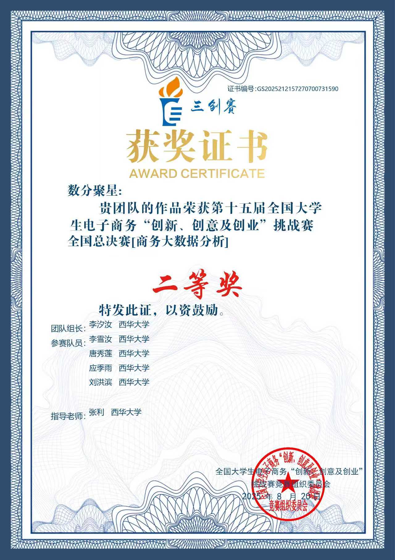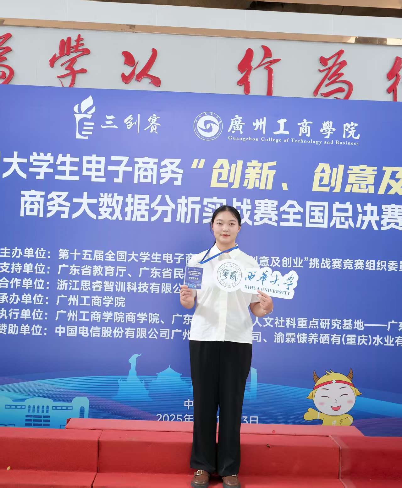 7月11日至13日,第十五届全国大学生电子商务“创新、创意及创业”挑战赛商务大数据分析实战赛全国总决赛在广州工商学院广州校区圆满落幕。本届大赛吸引了来自全国28个省、自治区、直辖市的98所高校、116支精英团队、逾600名师生同台竞技,选手们以智慧碰撞火花,用创新书写未来。经过多轮激烈角逐,我院2023级学科教学(思政)专业研究生唐秀莲所在团队凭借扎实的专业能力、创新的分析思路和出色的实战表现,最终脱颖而出,荣获全国二等奖。