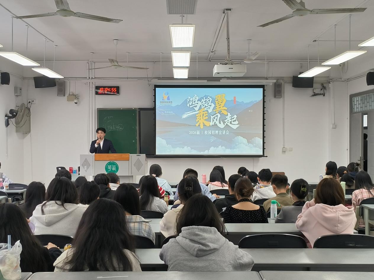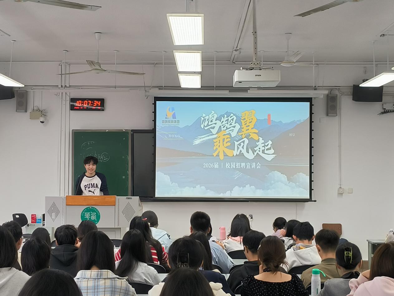 为进一步拓宽我院毕业生就业渠道,搭建优质校企合作平台,助力学子精准对接职场资源,2025年10月13日上午10点,学院邀请了鸿鹄教育集团来为2026届应届毕业生举办专场招聘,鸿鹄教育集团教师万志鹏为做了现场宣讲,此次专场招聘还邀请了我院2024届毕业生王小龙(现任职鸿鹄高级中学青白江校区)做了经验分享,2026届全体本科应届毕业生参加了此次招聘。