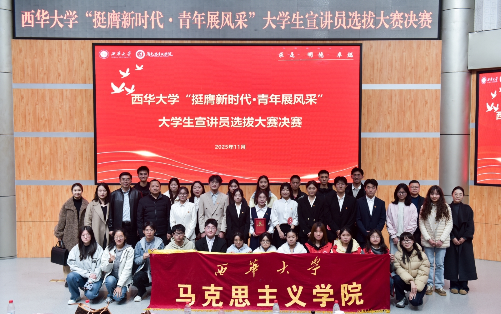 为深入学习贯彻习近平新时代中国特色社会主义思想,全面落实习近平总书记关于青年工作的重要论述,激励广大青年学生勇担时代使命、展现青春风采,2025年11月20日晚,西华大学“挺膺新时代·青年展风采”大学生宣讲员选拔大赛决赛在四教报告厅举行。经过激烈角逐,我院李雪琴、马家佳、陈浩瑜、邱杰梅、孔红静、吴立波、朱晗宁等7名同学进入决赛并取得优异成绩。