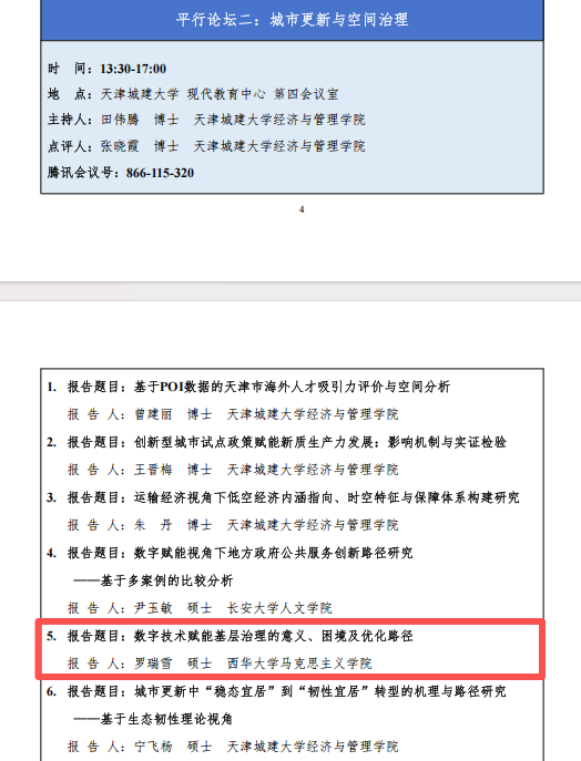 下午为平行分论坛研讨会。会议共设置2个平行论坛。分别围绕“城市更新与数字赋能”“城市更新与空间治理”展开专题研讨。我院2024级研究生罗瑞雪撰写的论文《数字技术赋能基层治理的意义、困境及优化路径》在“城市更新与空间治理”论坛进行发言。