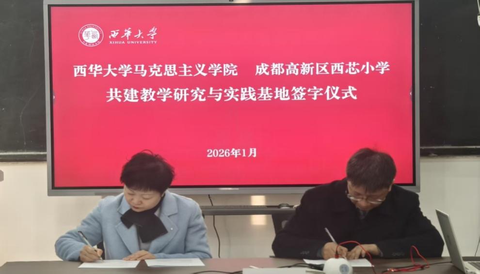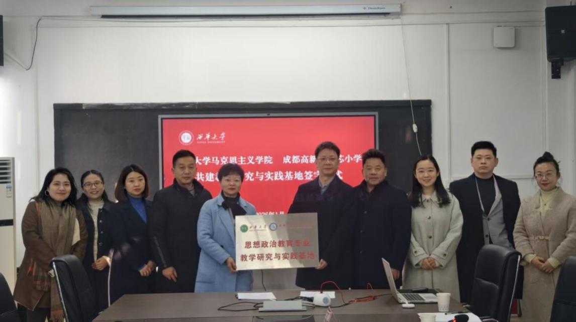 为深化大中小学思政教育一体化建设,充分发挥高校与小学各自优势,实现大中小学思政教育协同发展,2026年1月14日,西华大学马克思主义学院与成都高新区西芯小学共建教学研究与实践基地签字及授牌仪式顺利举行。西华大学马克思主义学院党委书记冯永泰、副院长尹德志、相关系室主任及老师,成都高新区西芯小学党支部书记兼校长许晓、副校长瞿代之等共同出席仪式。