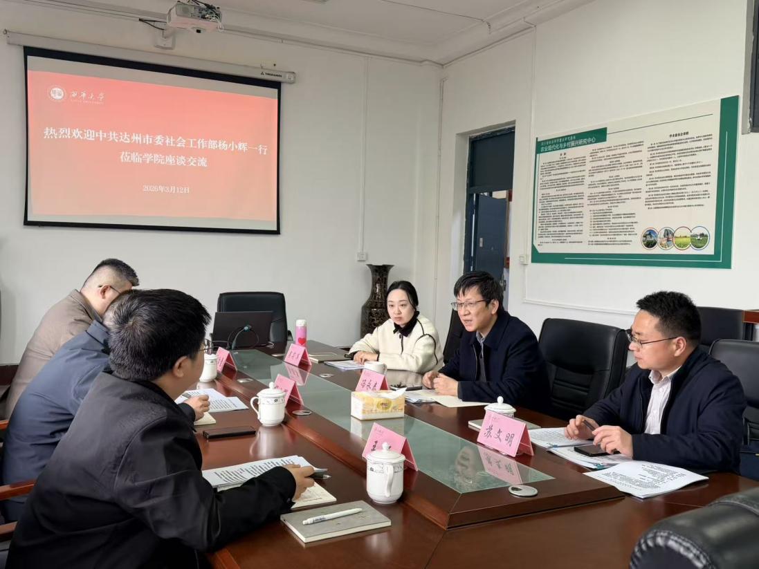 为深入学习贯彻党的二十届四中全会精神,加强校地合作,共同谋划“十五五”期间社会工作高质量发展,3月12日,中共达州市委社会工作部副部长杨小辉、中共达州市委社会工作部政策法规科科长王平及工作人员李治童一行赴学院开展专题学习交流。学院党委书记冯永泰教授、研究生院副院长苏文明教授和学院教师吴莉萍博士参加座谈会。